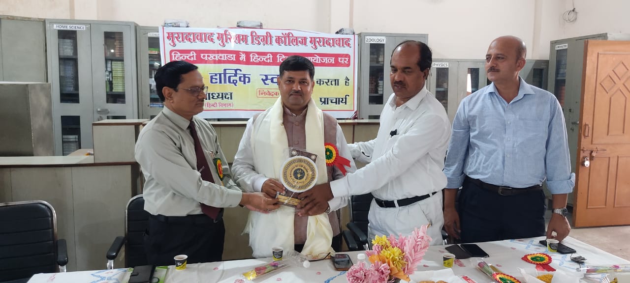 मुरादाबाद मुस्लिम डिग्री कॉलेज में हिंदी पखवाड़े के अंतर्गत हिंदी दिवस समारोह उत्साहपूर्ण वातावरण में मनाया गया। कार्यक्रम में वक्ताओं ने राष्ट्रभाषा हिंदी की महत्ता और इसके संवर्धन पर बल देते हुए कहा कि हिंदी केवल संवाद का माध्यम नहीं, बल्कि भारतीय अस्मिता और राष्ट्रीय एकता की आत्मा है।कार्यक्रम के मुख्य अतिथि साहित्यकार एवं महाराजा हरिश्चंद्र पीजी कॉलेज के प्रबंधक डॉ. काव्य सौरभ रस्तोगी ने कहा कि स्वतंत्रता संग्राम के दिनों में हिंदी ने पूरे देश को एक सूत्र में बांधने का कार्य किया। उन्होंने विद्यार्थियों से आह्वान किया कि वे हिंदी भाषा के प्रयोग पर गर्व करें और इसे आधुनिक तकनीक तथा वैश्विक मंच तक पहुंचाने में सक्रिय भूमिका निभाएं। इस अवसर पर डॉ. काव्य सौरभ को हिंदी गौरव सम्मान प्रदान किया गया। समारोह में कॉलेज के छात्र इमरान और छात्रा शीतल ने हिंदी पर अपने विचार प्रस्तुत किए। महाविद्यालय के प्रबंधक जुनेद-उल-हक ने कहा कि हिंदी का संरक्षण और संवर्धन हर भारतीय की जिम्मेदारी है। कार्यक्रम की अध्यक्षता प्रबंध समिति के अध्यक्ष एडवोकेट मोहम्मद जुनेद एजाज़ ने की। जबकि संचालन हिंदी विभागाध्यक्ष डॉ. रोमाना अंजुम ने किया। अंत में आभार प्रकट प्राचार्य डॉ. इश्तियाक अहमद आज़मी ने किया।