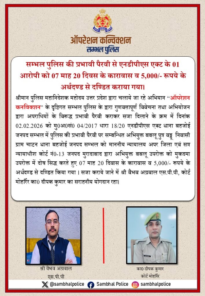 मुरादाबाद: उत्तर प्रदेश के पुलिस महानिदेशक द्वारा चलाए जा रहे “ऑपरेशन कनविक्शन” के तहत सम्भल पुलिस और अभियोजन पक्ष को बड़ी सफलता मिली है। नशा तस्करों के खिलाफ अभियान को धार देते हुए विशेष लोक अभियोजक (S.P.P.) वैभव अग्रवाल की प्रभावी पैरवी ने अपराधियों की कमर तोड़ दी है। सोमवार, 2 फरवरी 2026 को जनपद मुरादाबाद की माननीय अपर जिला एवं सत्र न्यायाधीश (कोर्ट नं. 13) ने एनडीपीएस एक्ट के एक पुराने मामले (मु.अ.सं. 04/2017) में फैसला सुनाया। थाना बहजोई क्षेत्र के ग्राम चाटन निवासी अभियुक्त बबलू पुत्र वडू को कोर्ट ने दोषी करार देते हुए:07 माह 20 दिवस का कारावास 5,000/- रुपये का अर्थदण्ड की सजा सुनाई है। इस सजा को दिलाने में S.P.P. वैभव अग्रवाल के कानूनी तर्कों और कोर्ट मोहर्रिर कांस्टेबल दीपक कुमार की प्रभावी भूमिका रही।सम्भल जनपद के नशा तस्करों के विरुद्ध पैरवी का एक नया कीर्तिमान स्थापित किया । एडवोकेट वैभव अग्रवाल के नेतृत्व में अभियोजन टीम ने पिछले 5 दिनों के भीतर 5 अलग-अलग मामलों में सजा कराकर यह साफ कर दिया है कि अब ड्रग माफियाओं की खैर नहीं।नशे के कारोबारियों पर भारी पड़ता वैभव अग्रवाल का यह अभियान अब जनपद में चर्चा का विषय बना हुआ है। स्थानीय नागरिकों ने पुलिस और अभियोजन की इस सक्रियता की सराहना की है।