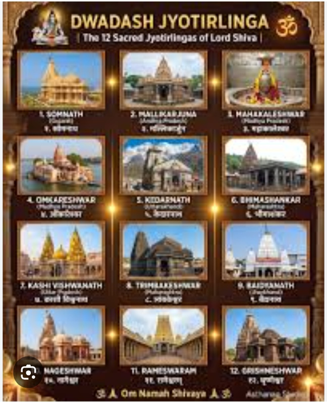 महाकालेश्वर ज्योतिलिंग, ओंमकारेश्वर ज्योतिर्लिंग (उज्जैन), द्वारकाधीश, भेंट द्वारिका, नागेश्वर ज्योतिर्लिंग, सिग्नेचर ब्रिज, सोमनाथ ज्योतिर्लिंग (गुजरात), त्रियंबकेश्वर ज्योतिर्लिंग , पंचवटी, कालाराम मंदिर, भीमाशंकर ज्योतिर्लिंग (गुजरात), घृष्णेश्वर ज्योतिर्लिंग (संभाजी नगर).