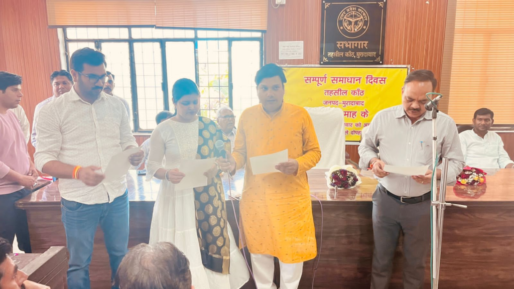 MORADABAD.भारतीय जनता पार्टी के शीर्ष नेतृत्व द्वारा जिला अध्यक्ष भारतीय जनता पार्टी आकाश पाल की संस्तुति पर जिला अध्यक्ष एससी मोर्चा देवराज सिंह जाटव की पत्नी प्रीति जाटव, कांठ नगर के फकीरगंज निवासी मोहित चौहान एवं गौरव बिश्नोई को नगर पंचायत कांठ का सभासद नामित किया गया था। भाजपा द्वारा नामित इन तीनों सभासदों का शपथ ग्रहण समारोह कांठ तहसील परिसर के सभागार में बुधवार को प्रातः 11:00 बजे किया गया। भाजपा के सभी कार्यकर्ताओं के द्वारा नामित सभासदों को फूलमालाएं पहनाकर स्वागत किया गया। एसडीएम कांठ संतदास पंवार ने सभी तीनों नामित सभासदों को पद एवं गोपनीयता की शपथ दिलाई। इस दौरान कांठ नगर पंचायत के सभी नामित सभासदों ने ईमानदारी और कर्तव्यनिष्ठा के साथ कार्य करने की शपथ ग्रहण की। पूर्व विधायक राजेश कुमार चुन्नू ने कहा कि भाजपा की सरकार जनहित के मुद्दों पर कार्य कर रही है। सभी नामित सभासद राष्ट्र के निर्माण में सक्रिय भूमिका निभाएंगे और जनहित के मुद्दों पर कार्य करेंगे। मुकेश माहेश्वरी ने कहा कि आशा है कि सभी नव-नामित सभासद नगर के विकास, स्वच्छता, पेयजल, सड़क और अन्य मूलभूत सुविधाओं को बेहतर बनाने में महत्वपूर्ण योगदान देंगे।सभासदों के शपथ ग्रहण समारोह के अवसर पर एसडीएम कांठ संतदास पंवार, तहसीलदार राजकुमार सिंह, कांठ नगर पंचायत के ईओ,पूर्व बीजेपी विधायक कांठ राजेश कुमार चुन्नू,बीजेपी एससी मोर्चा के जिलाध्यक्ष देवराज सिंह जाटव, हुकुम सिंह,सत्यवान सिंह राजपूत,मुकेश माहेश्वरी, विक्रांत चौधरी,सुरेन्द्र सिंह विश्नोई, अंकुश चौहान,प्रमोद चौहान,पारुल चौहान, ओमप्रकाश सिंह,अम्बरीष शर्मा,शीशपाल सिंह सैनी,मनोज चौहान,डॉ नेपाल सिंह,सभासद चमन प्रजापति,सभासद परवेज़ अहमद,सभासद खलील सिद्दीकी,अमित ठाकुर,अमित विश्नोई आदि उपस्थित रहे।