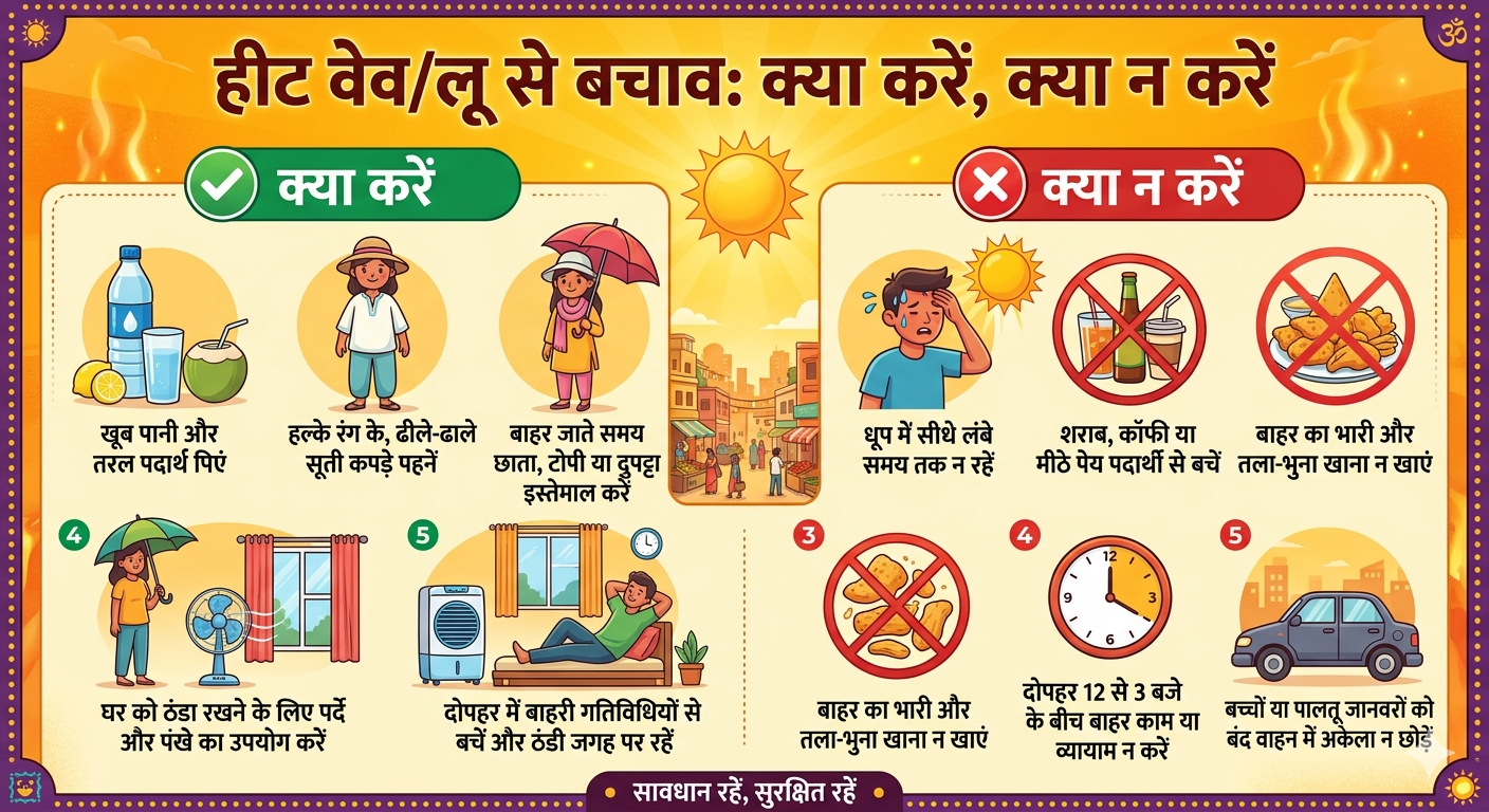 मुरादाबाद, उ०प्र० राज्य आपदा प्रबंधन प्राधिकरण द्वारा समय-समय पर जारी दिशा-निर्देशों एवं जिलाधिकारी के आदेश के अनुपालनार्थ हीट वेव/लू से बचाव जन-जागरूकता हेतु जनहित में जारी- क्या करे, क्या न करे के संबंध में दिशा निर्देश जारी किए गए हैं। अपर जिलाधिकारी वित्त एवं राजस्व श्रीमती ममता मालवीय ने बताया कि हीट वेव और लू से बचाव के संबंध में प्रचार माध्यमों पर हीट वेव/लू की चेतावनी पर ध्यान दिया जाए, अधिक से अधिक पानी पियें, हल्के रंग के पसीना शोषित करने वाले वस्त्र पहनें, धूप के चश्में, छाता, टोपी, व चप्पल का प्रयोग करें, अगर आप खुले में कार्य करते है तो सिर, चेहरा, हाथ पैरो को गीले कपड़े से ढके रहे तथा छाते का प्रयोग करें। उन्होंने बताया कि यात्रा करते समय पीने का पानी अपने साथ ले जाएं। ओ०आर०एस०, घर में बने हुये पेय पदार्थ जैसे लस्सी, चावल का पानी (माड), नीबू पानी, छाछ आदि का उपयोग करें, जिससे कि शरीर में पानी की कमी की भरपाई हो सके, हीट स्ट्रोक, हीट रैश, हीट क्रैम्प के लक्षणो जैसे कमजोरी, चक्कर आना, सरदर्द, उबकाई, पसीना आना, मूर्छा आदि को पहचानें एवं लक्षण की स्थिति में तत्काल नजदीकी अस्पताल में सम्पर्क करें, यदि मूर्छा या बीमारी अनुभव करते है तो तुरन्त चिकित्सीय सलाह लें। जानवरों को छायादार स्थानों पर रखें तथा उन्हें पर्याप्त मात्रा में पानी पीने को दिया जाए, अपने घरों को ठण्डा रखे, पर्दे दरवाजे आदि का उपयोग करे तथा शाम/रात के समय घर तथा कमरों को ठण्डा करने हेतु इसे खोल दे, पंखे गीले कपडों का उपयोग करें तथा बारम्बार स्नान करें, कार्य स्थल पर ठण्डे पीने का पानी रखें, कार्य करने वाले कर्मियों को सीधी सर्यू की रोशनी से बचने हेतु सावधान करे, श्रमसाध्य कार्यों को ठण्डे समय में करने/कराने का प्रयास करें। घर से बाहर होने की स्थिति में आराम करने की समयावधि तथा आवृत्ति को बढ़ायें। गर्भस्थ महिला कर्मियों तथा रोगग्रस्त कर्मियों पर अतिरिक्त ध्यान देना चाहिए। इसके साथ ही अग्नि के उपयोग वाले सभी कार्य सुबह जल्दी निपटा लें। उन्होंने हीट वेव और लू से बचाव हेतु क्या न करे के संबंध में बताया कि बच्चों तथा पालतू जानवरो को खड़ी गाडियों में न छोड़ें, दोपहर 12 बजे से 03 बजे के मध्य सूर्य की रोशनी में जाने से बचें। गहरे रंग के भारी तथा तंग कपड़ें न पहनें। जब बाहर का तापमान अधिक हो तब श्रमसाध्य कार्य न करे, अधिक गर्मी वाले समय में खाना बनाने से बचें, रसोई वाले स्थान को ठण्डा करने के लिये दरवाजे तथा खिडकियों खोल दे। उन्होंने बताया कि शराब, चाय, काफी, कार्बोनेटडे साफ्ट ड्रिंक आदि के उपयोग करने से बचें क्योंकि यह शरीर में निर्जलीकरण करता है। खुले स्थानों पर अग्नि व ज्वलनशील पदार्थों का प्रयोग तेज हवा की स्थिति में न करे